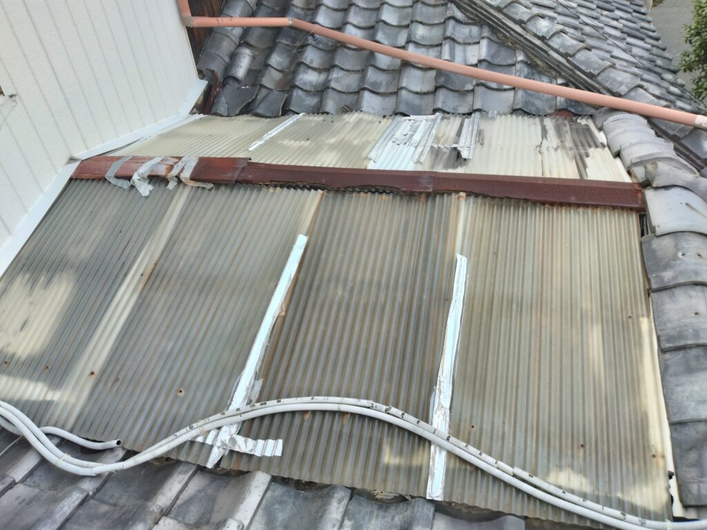 玄関の上のトタン屋根(波板)からの雨漏り修理です 後から隣との間に作られた屋根で、波板の劣化とその雨水を受ける雨樋がうまく機能しておらず雨漏りを起こしていたようでした。