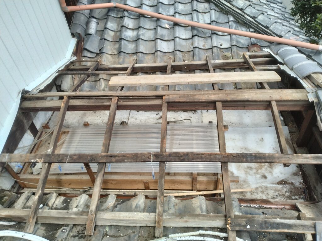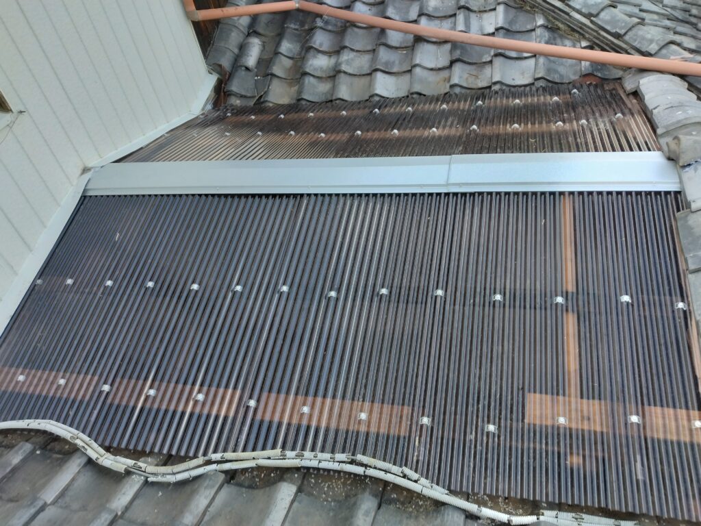 屋根をめくり下地の一部を取替、雨樋の調整をしてから波板の屋根を作り替えました