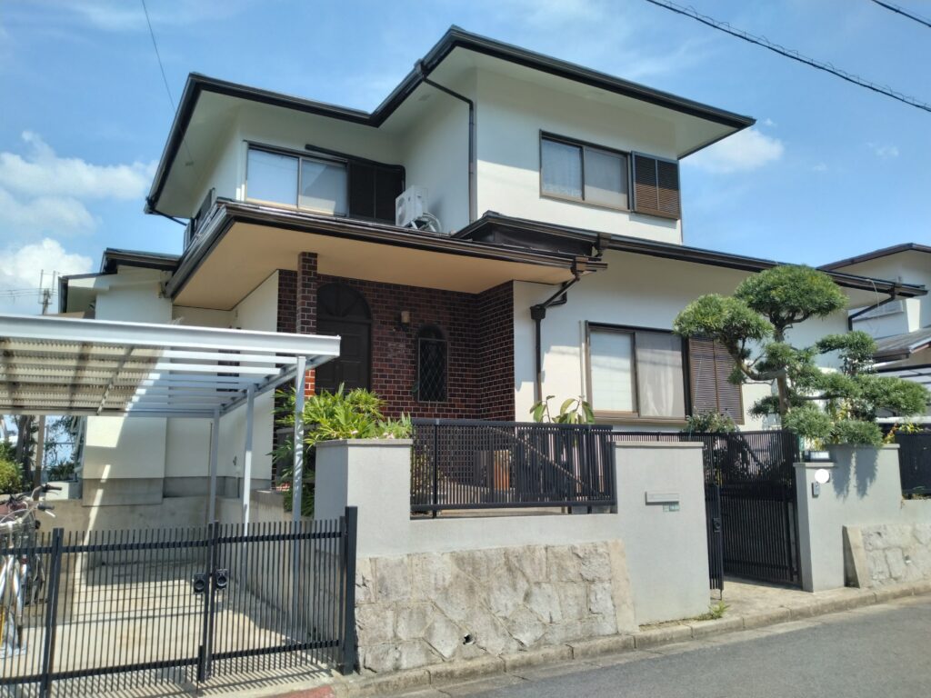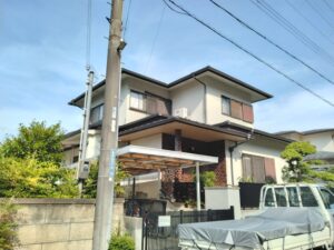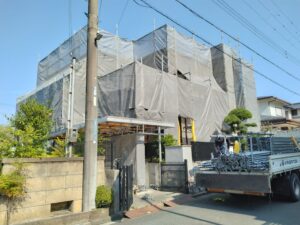 仮設足場を設置しての外壁塗装工事です