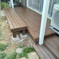 5年程前に設置したウッドデッキの補修工事です 床板を全てめくり、傷んだ基礎や根太を交換し、床板を張り替えまし …